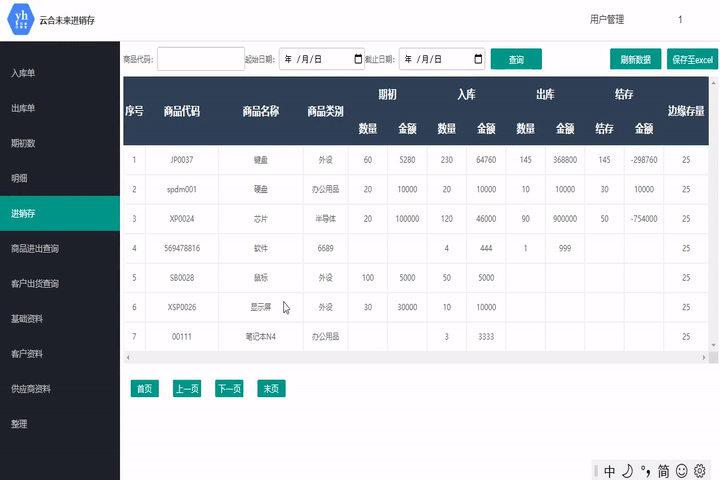 此模塊統計所有商品的期初、入庫、出庫,得出結存。可按照商品或日期進行查詢