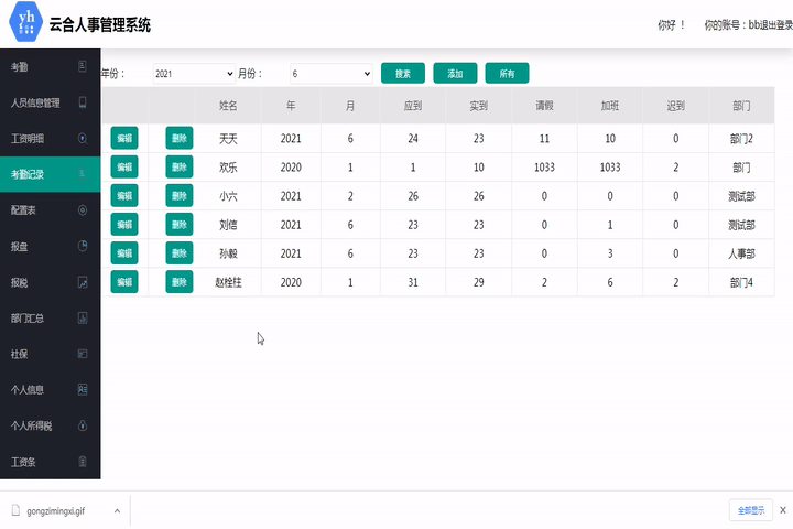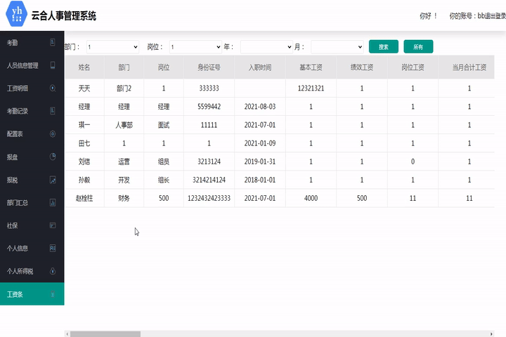 此模塊用于記錄員工每月的工資詳情,可以根據部門、崗位、姓名查詢以往記錄。